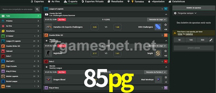 O 85pg oferece uma grande seleção de opções de apostas em e-sports com probabilidades competitivas